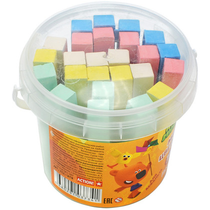 25 квадратных ярких мягких мелков 5 цветов упакованы в удобное пластиковое ведро, которое в дальнейшем может быть использовано для игровых целей.